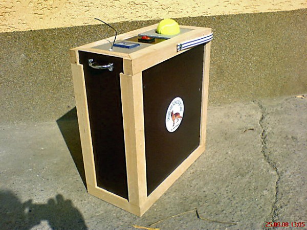 Die Geräte werden in Einzelanfertigung hergestellt. Die Ballwurfmaschine ist einzigartig in Deutschland und wurde von mir entwickelt und gebaut. Sie hat den Vorteil gegenüber bereits anderen existierenden Ballwurfmaschinen wie z. B. Dogtrophy , das der Ball nicht nur einfach aus dem Gerät fällt,sondern der Ball ca. 1,5m in die Luft geschossen wird. Bei einer Aufstellung des Gerätes unterhalb der Bodenoberfläche ( Loch im Erdboden ausheben) ist das Gerät nicht vom Hund zu sehen. Die Bestätigung (Ballabschuß) kann individuell durch eine integrierte Funkfernsteuerung ausgelöst werden.Besonders zu empfehlen ist der Einsatz des Gerätes beim Kommando" Vorraus".Da ich die Geräte in meiner Freizeit anfertige,können Sie nicht von einer industriellen Verarbeitung ausgehen.dennoch garantiere ich eine hochwertige handwerkliche Ausführung.Die gezeigten Bilder stellen meinen Prototyp dar,welcher die Tests verschiedener Hundesportfreunde mit bravour bestanden hat. Der gelieferte Artikel kann optisch vom Prototyp abweichen. Das Gerät wird von einem Blei Gel Akku 12 Volt, 7 Ah gespeist, welcher eine sehr lange Einsatzmöglichkeit bietet. Zum Lieferumfang gehört ebenfalls ein 12 V Ladegerät. Die Reichweite der Funkfernsteuerung beträt bei freiem Sichtfeld ca. 50m. Geladen wird das Gerät manuell,durch spannen der Abschußfeder.Der Abschuß selbst wird durch die Fernsteuerung ausgelöst.Sollten Beanstandungen am Gerät vorliegen,welche die ornungsgemäße Funktion betreffen, werde ich das Gerät kostenlos instandsetzen. Dies gilt für einen Zeitraum von 1 Jahr ab Kaufdatum.. Dem Gerät liegt eine Bedienungsanweisung bei.Beim Kauf des Gerätes erklären Sie sich mit den von mir gemachten Angaben als einverstanden. Die Lieferzeit beträgt ca. 10 Tage. Es besteht auch die Möglichkeit das Gerät bei mir zu testen und abzuholen. Telefonisch bin ich zu erreichen unter 03636769024, mobil: 017648036628, Fax: 03636769026, mail: beate-hofmeister@alice-dsl.net